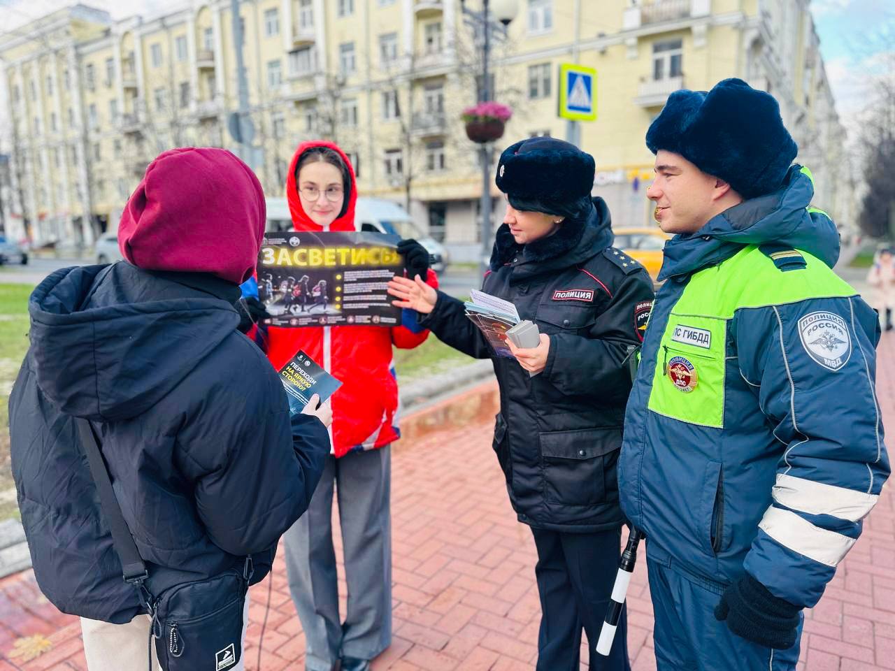Всем участникам акции вручили тематические буклеты и световозращающие элементы в виде наклеек.