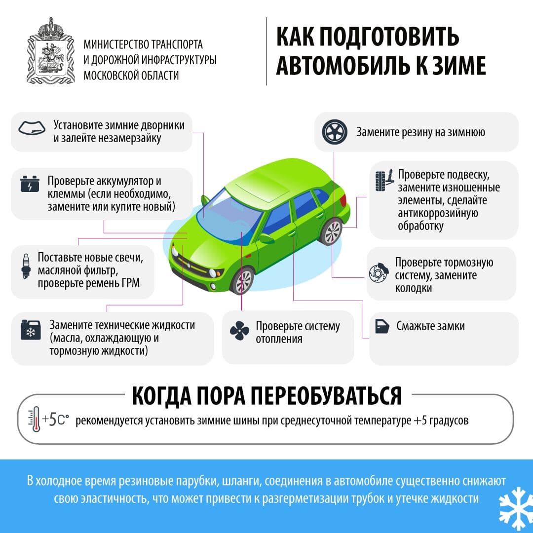 Необходимо проверить ремень ГРМ, систему отопления, тормозную систему, подвески, аккумулятор и клеммы (если необходимо, заменить или купить новый), поставить новые свечи, масляной фильтр, смазать замки, заменить технические жидкости (масла, охлаждающую и тормозную жидкости), колодки, изношенные элементы, сделать антикоррозийную обработку, смазать замки, установить зимние дворники и залить незамерзайку.
