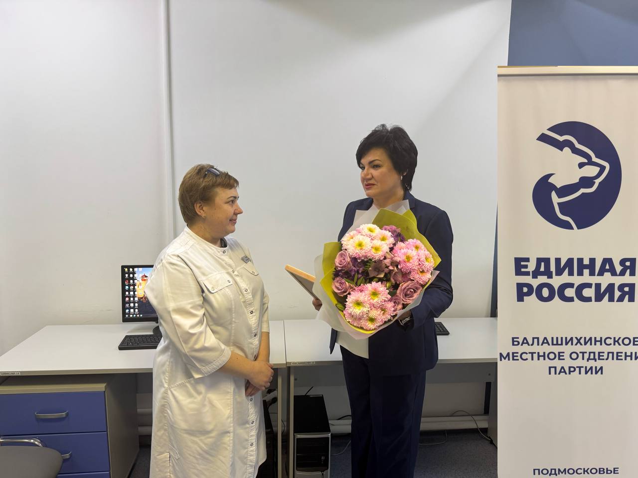 В рамках партийного проекта «Единой России» «Здоровое будущее» в поликлинике №13 прошло торжественное мероприятие, приуроченное к недавно прошедшему профессиональному празднику – Дню терапевта. Координатор партийного проекта в Балашихе, Наталья Алимова, лично поздравила врачей и вручила им почётные грамоты.