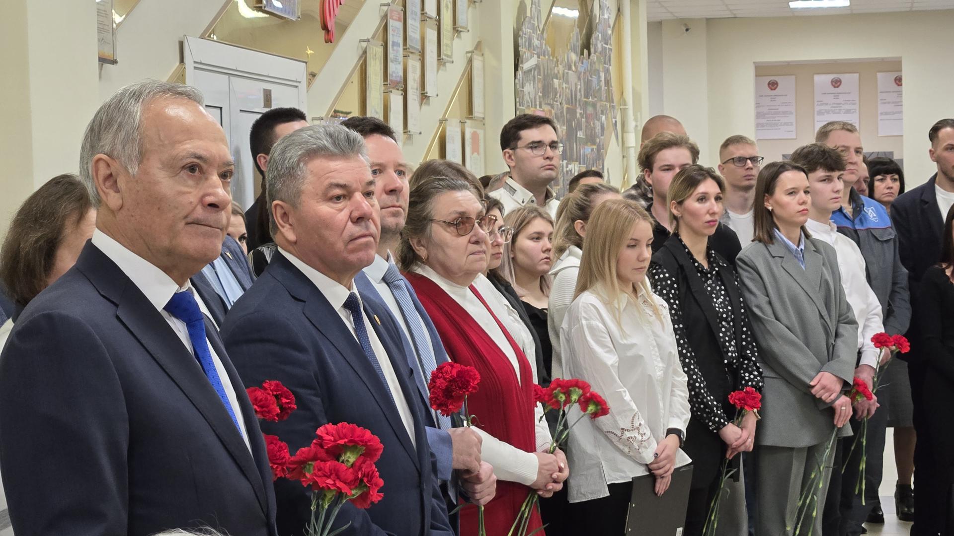 Собравшиеся возложили цветы к барельефу В.И. Пчелинцева. Рельефную скульптуру изготовили и установили в 2013 году в вестибюле главного корпуса по инициативе Игоря Смирнова.